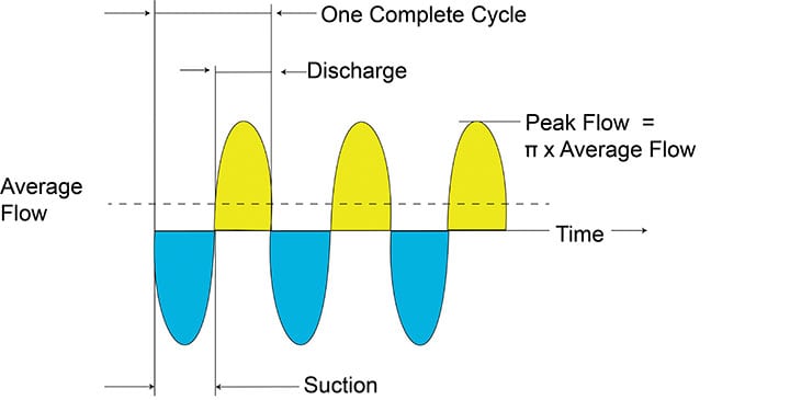 1. 泵送動作是由往復(fù)動作發(fā)展而來的。這種往復(fù)運(yùn)動產(chǎn)生流動正弦波。實(shí)際流量由圖 1 中的公式確定。