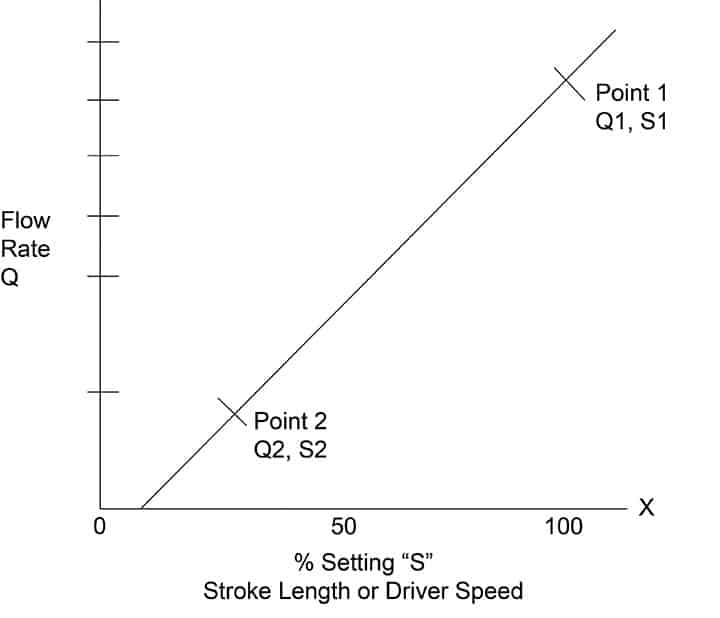 3、計(jì)量泵流量與沖程特性曲線呈線性關(guān)系(圖3)。然而,它不一定成比例,因?yàn)?50% 的沖程設(shè)置可能不等于 50% 的流量。這是因?yàn)樾?zhǔn)線可能不會同時通過兩個軸上的 0。通過在兩個沖程設(shè)置下測量流量,繪制兩個點(diǎn)并通過它們畫一條直線,可以準(zhǔn)確預(yù)測其他流量與沖程的關(guān)系。