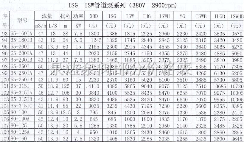 以下是我公司管道泵的部分價(jià)格表